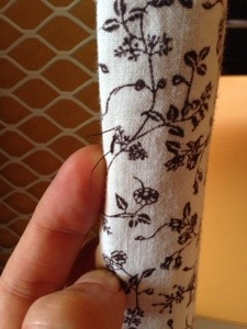 I took off the old cover and kept the cord so I could use it again. The old cover was pretty crinkled and it was difficult to lay it out on top of the new fabric, but I managed it after giving the cover a quick iron. How, you ask? I put three cloth nappies on top of the ironing board as a makeshift cover. 🙂