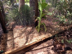 We figured we would put in a whole row of plants, allowing each individual a chance to hide amongst the rest and to grow up above the pecking height of the chickens. With the removal of the bulky old feeder set up, a nice bit of space was revealed, and the idea of the garden bed was born.
