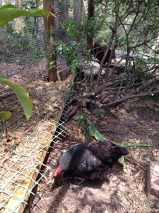 We used compost, manure and hay to make a Lasagne-layer filling for the new bed, and some old bit of green plastic fence mesh as a topper. The chickens were pretty excited when the compost went in! Now that we have put the mesh on top they are less impressed, but they are perching on the bed, so we figured that it has provided them with a little extra entertainment. 🙂 The new Arrowroot plant seems to be faring quite well. It still has leaves!