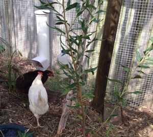 Outside the coop we have some Queensland Arrowroot growing in a tub. It provides a good deal of summer protection from the North sun, and we have been experimenting with growing it inside the coop for the chickens to nibble on. We’ve had one plant “growing” inside the coop over the summer. I say “growing”, because this plant is just clinging to life. Every time it even thinks of sprouting a new leaf, it gets pounced on and savaged. Our chookies like their greens!