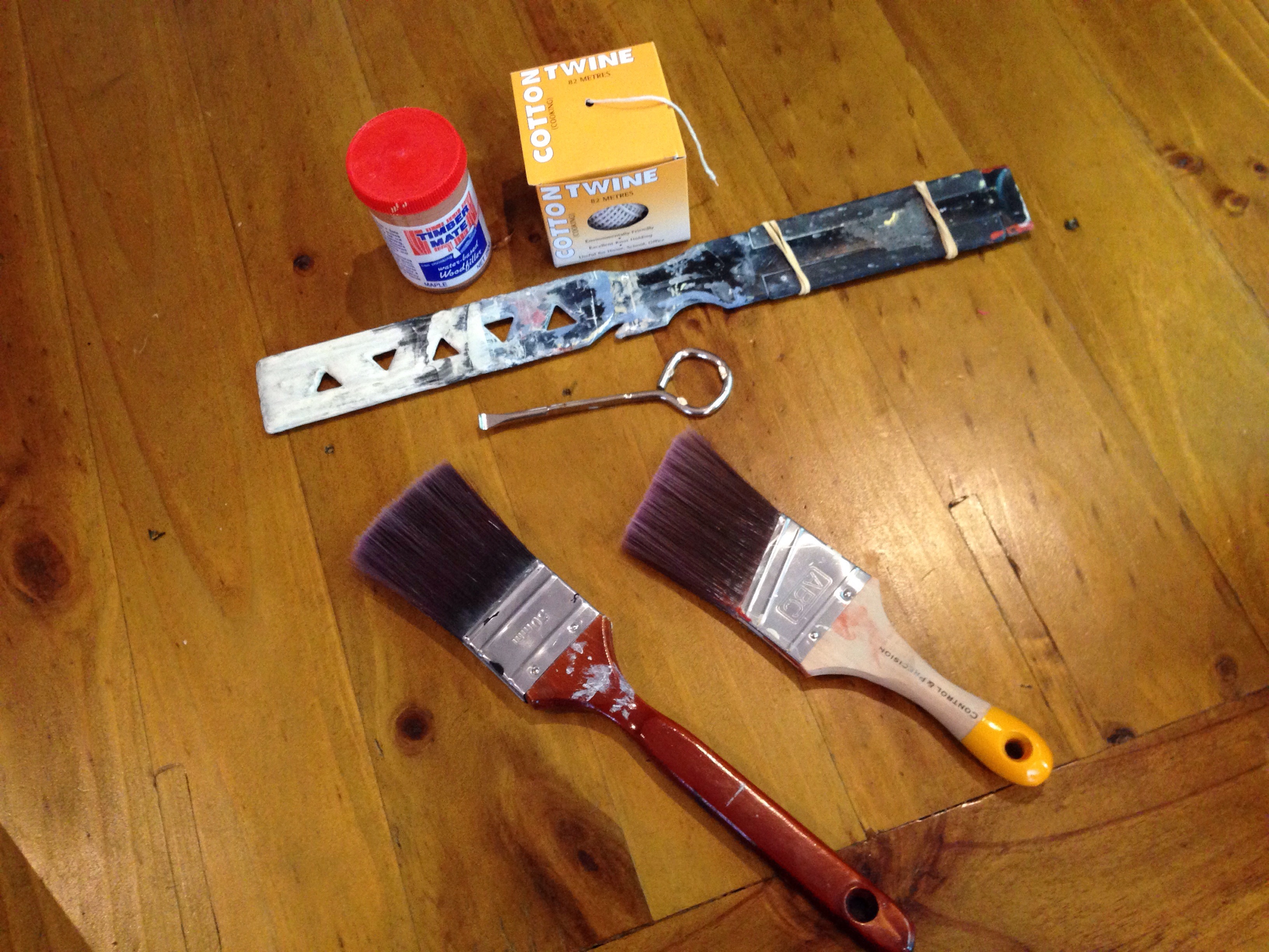 You can also see the paint-can opener (the metal thing with a loop). Get one of these. A couple of bucks of pure awesome. I won’t destroy a paint tin again, it is so easy to open my paint.