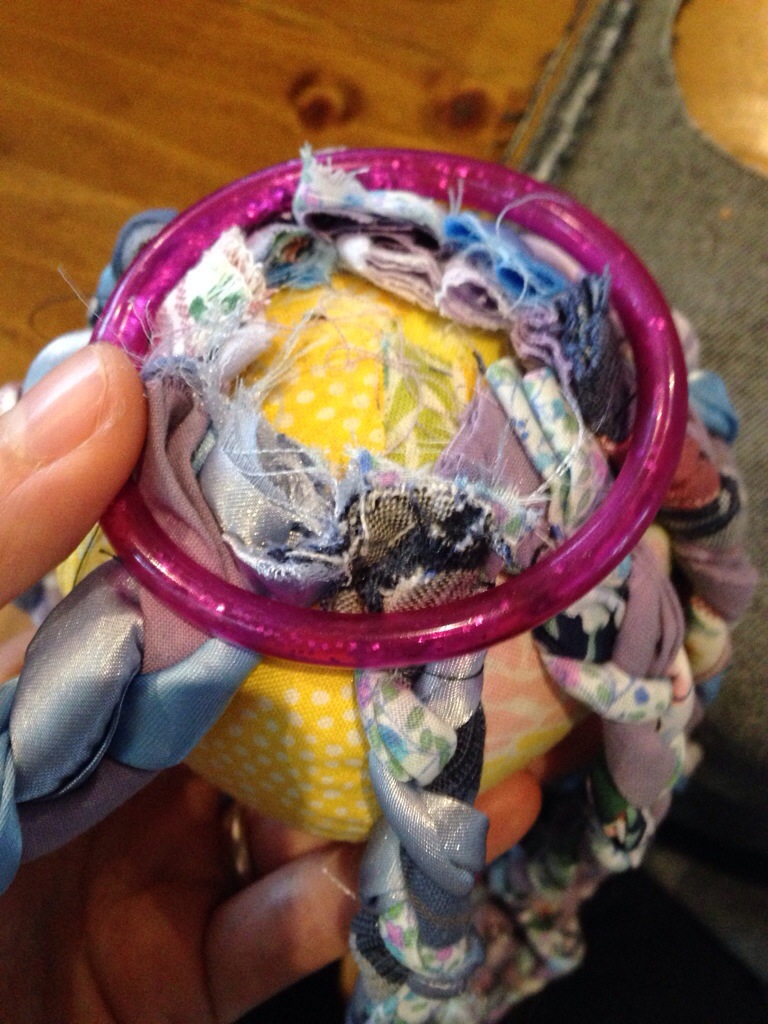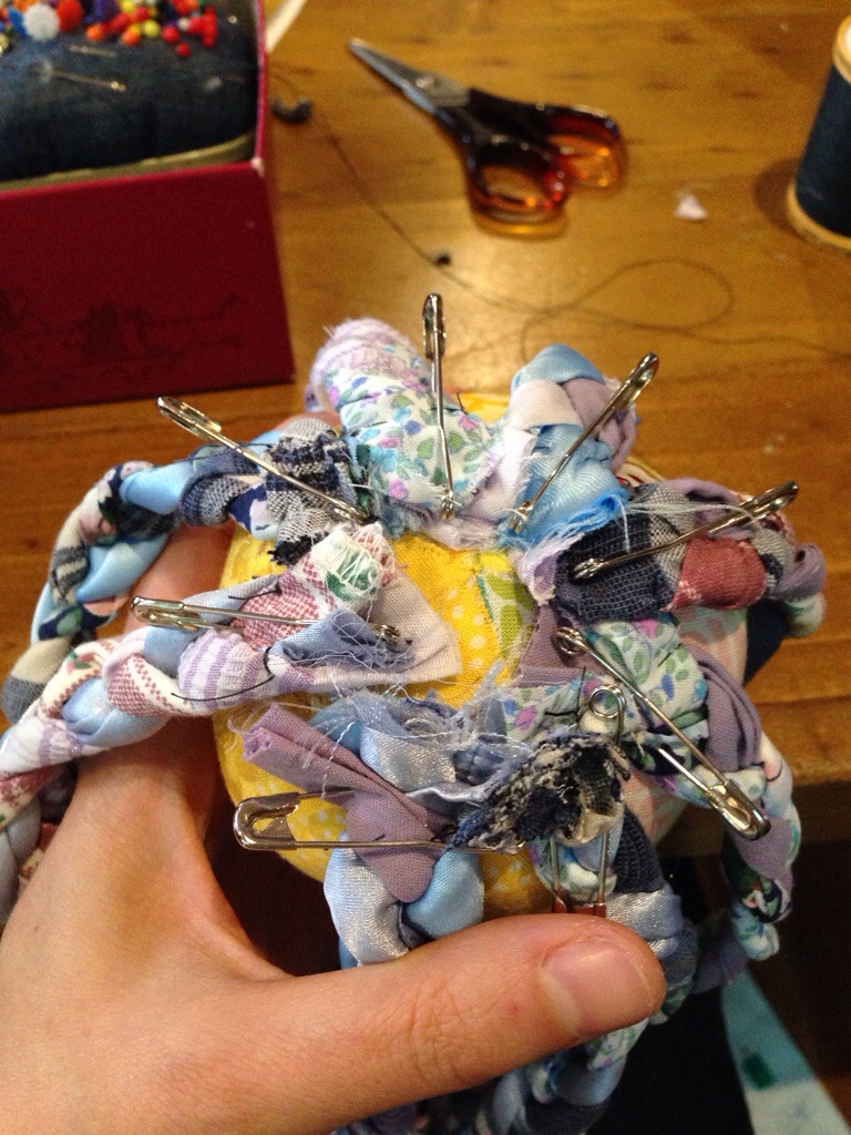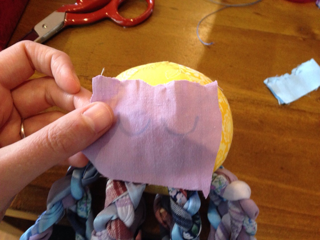 We are going to attach the legs and then cover the join with a piece of fabric that matches the body of the octopus (or, alternatively, matching the legs). You might remember picking out the body fabrics and having one piece left over: that’s what this is for! I’ve used a piece of a man’s tie as my coordinating fabric. It can be whatever you like. 🙂 The other thing you need to do is to trim the excess fabric away from your legs, and decide which way “up” they will go. The top of the plait needs to be secured with thread instead of a safety pin.