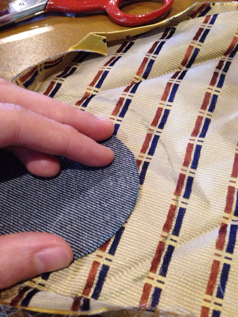 Once you have the piece secured to your liking, it’s time to stitch it down. I used a piece of sturdy thread for this (no. 8 perle cotton, in fact). It doesn’t need to be that strong, but I like the decorative look of the stitching. You want it to be sturdy to cope with the legs being pulled on.