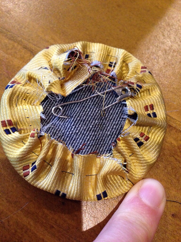 Use a safety pin in the centre to make sure your fabrics don’t slip about (especially if you used tie silk like mine!) 🙂 Pull up the thread to cause the allowance to gather up and fold over the denim:
