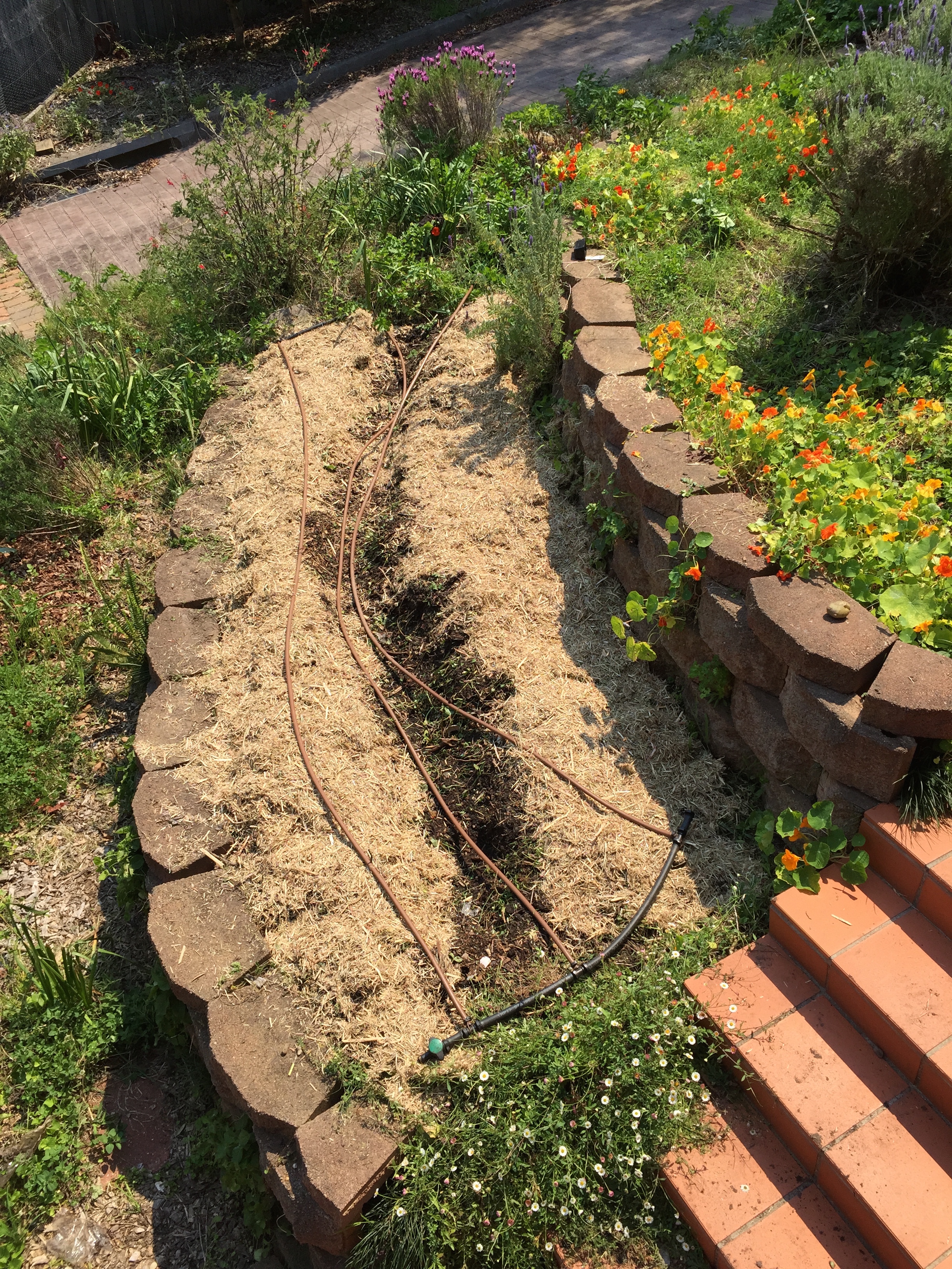 I salvaged a few baby parsnips and then moved the irrigation hose out of the way, because it was mattock time! I’m pretty hopeless with the spade because I can’t get the blade the cut deep enough (it’s a little blunt, and I’m a wee bit feeble). But the mattock makes short work of the weeds. 🙂