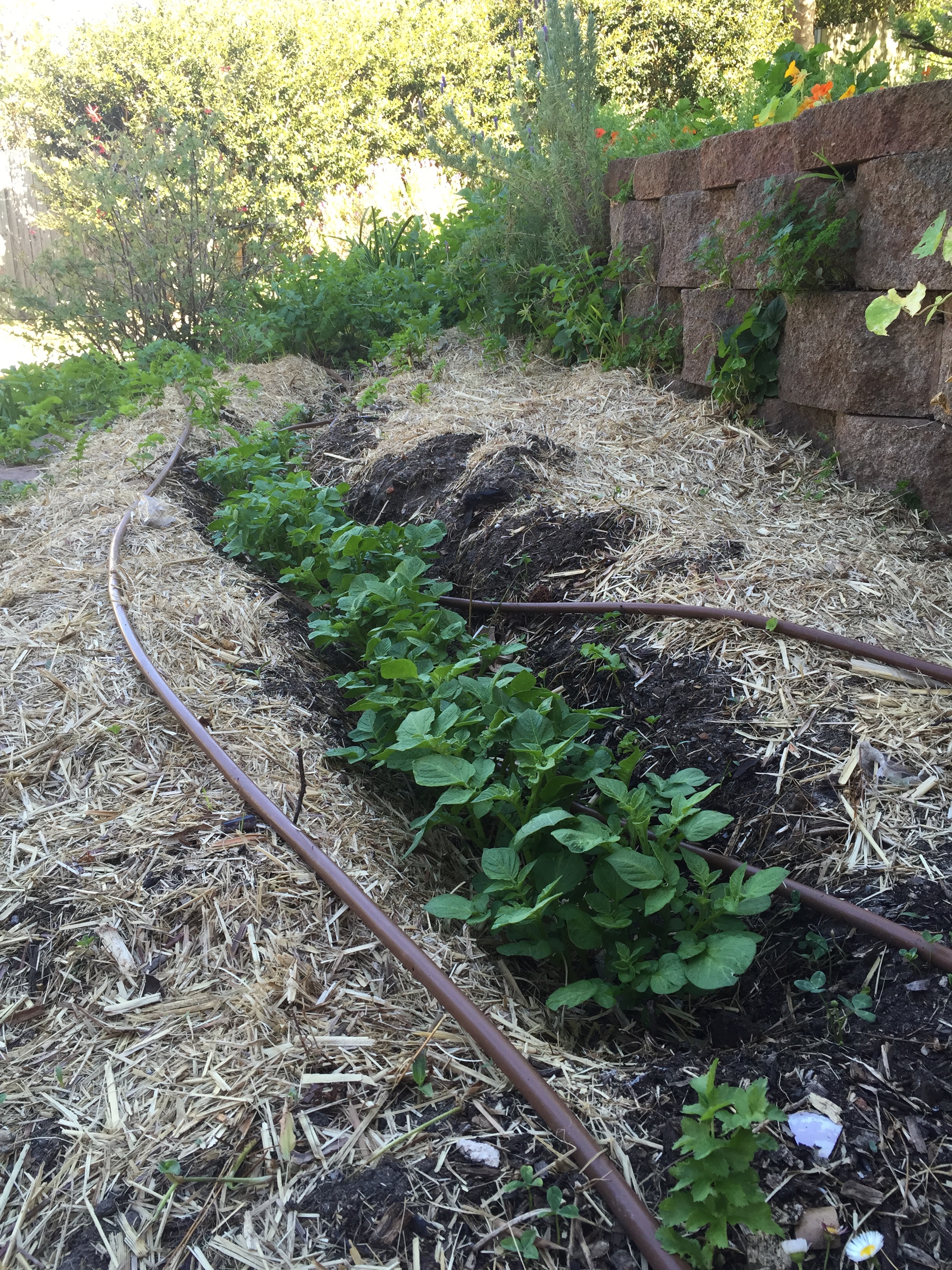 This weekend we mounded them up — covered most of the green parts over with more soil and mulch. We will keep doing this as long as we can, and the potatoes will make tubers all along the stems we’ve covered up.