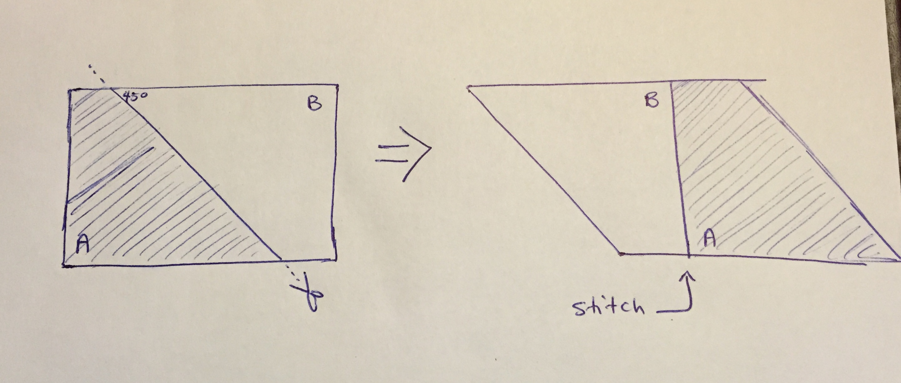 Once you do the cut-and-shift manouevre and sew that seam, you end up with a lovely parallelogram with 45° angles at the pointy corners. Yay.