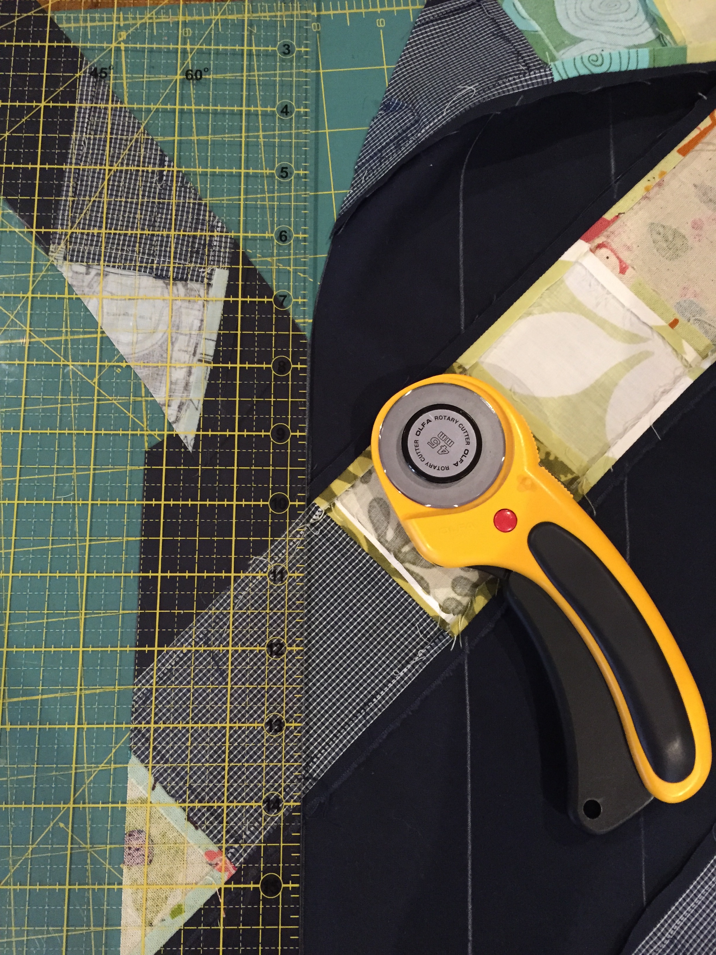 To make this cut I first ruled a chalk line at 45° from top to bottom. As luck would have it, I placed this line very well: a bit offset from the top left, near one of the joins between the scrappy and navy fabrics.