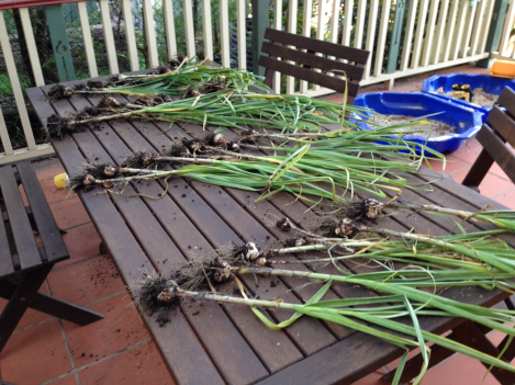 I’ve laid all thirty-one bulbs out on the patio table, under cover and separated to give them lots of airing room. Over the next week or so, they will dry out. Then I can brush away the dirty skin layer and store them.