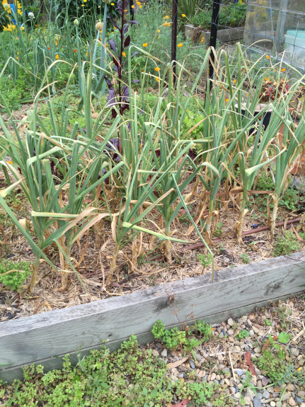 I went out into the garden, today, to catch up on how things are growing. I looked at my garlic patch and thought to myself: “These look like they are just about ready!”