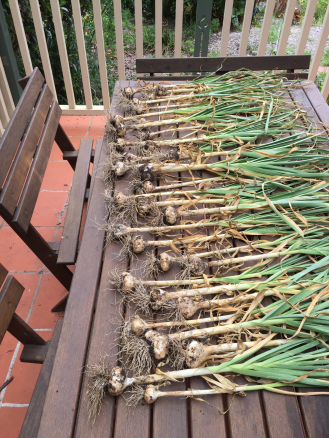 The picture above is of last year’s garlic crop. There are only a few (about 8) large bulbs from that crop, but we must have had a similar number of bulbs in total. Notice how quite a lot of these stalks are thin and spindly? They match up with small bulbs with only a couple of cloves.