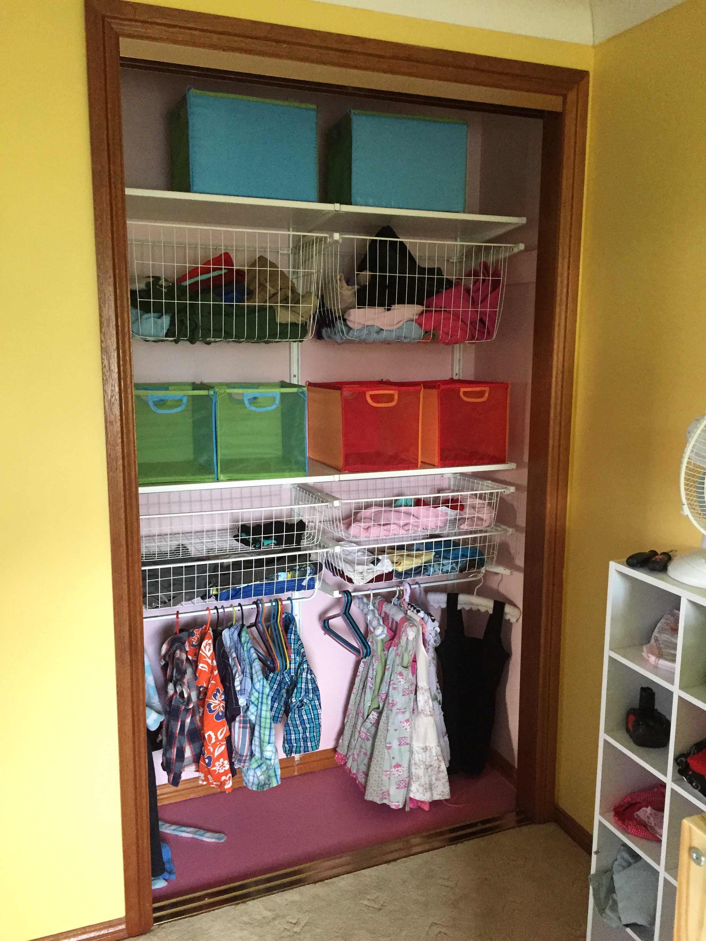 This might be okay for a grown-up with shirts and dresses to hang (although my own experience says “not!”), but the little kids can’t reach the rail, and the space is largely wasted.