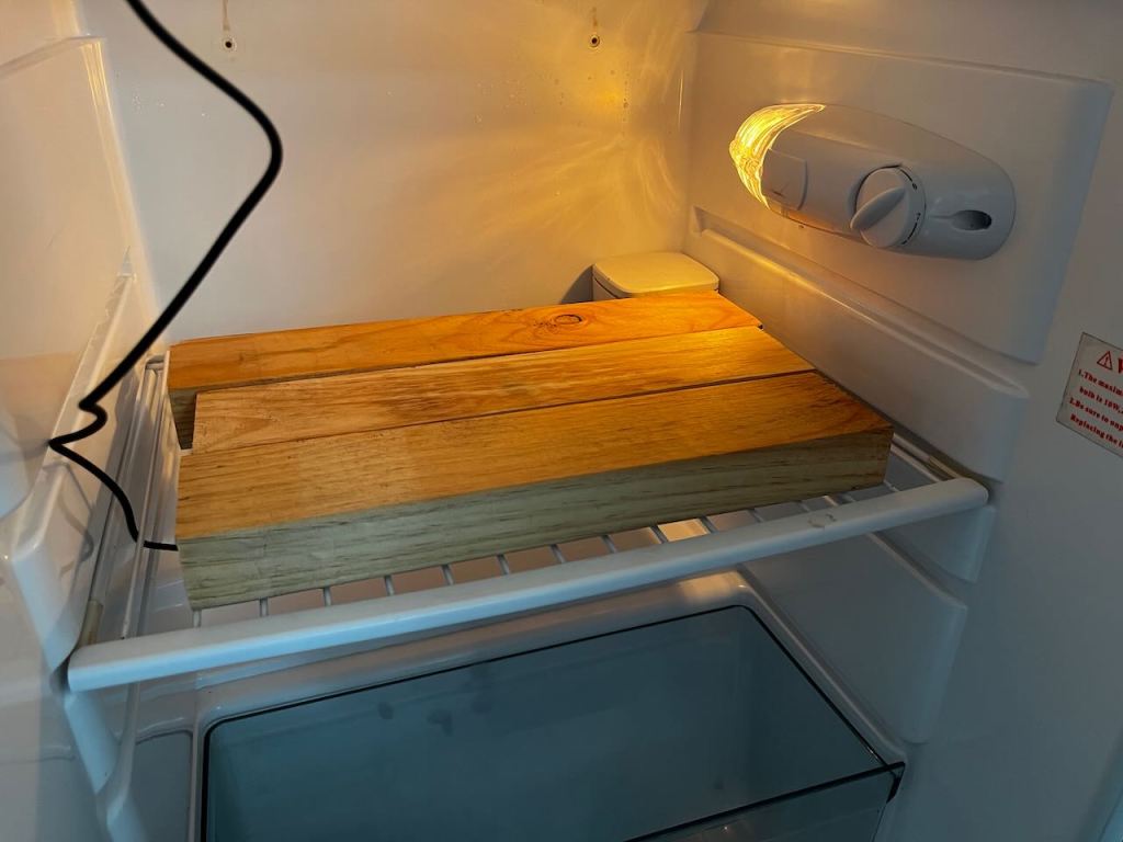 It’s an old bar fridge (the kind without any auto-defrost features) with the freezer shelf removed.