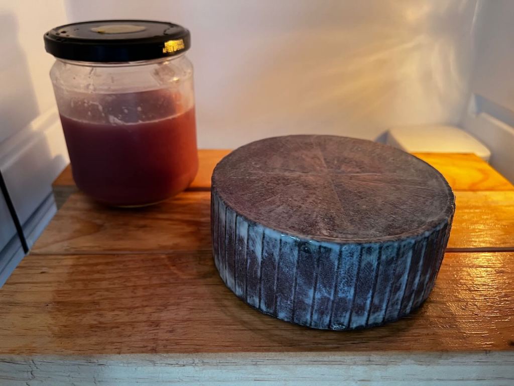 I couldn’t keep the mould on my Drunken Goat cheese under control, so I tried to work with the mould instead of against it. I attempted to put a schmier onto the cheese: