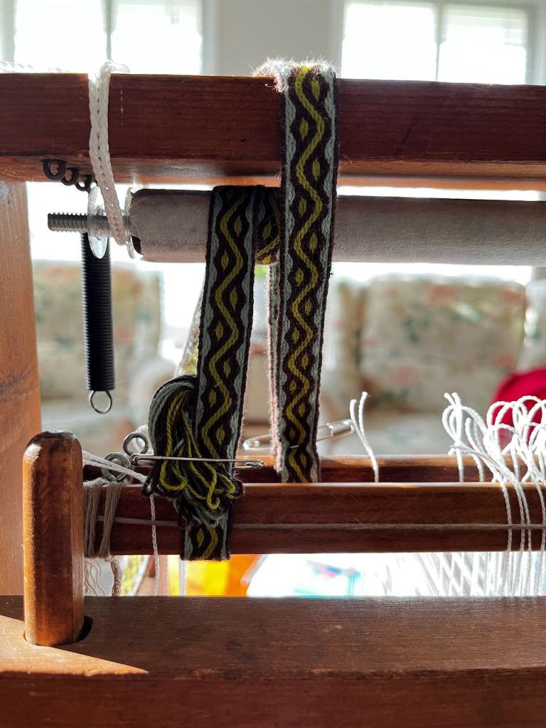 The last part of the warp I used up sampling with some dark green wool I had purchased to make viking leg wraps.