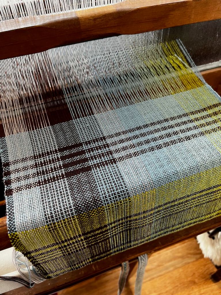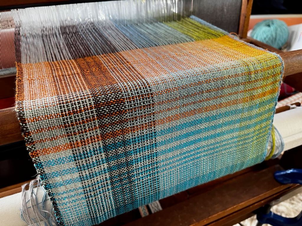 I wanted to see what happened when I blended pairs of colours, so the warp includes a gradation from the blue to the green as well as mixing brown with stone, brown with blue and blue with stone.