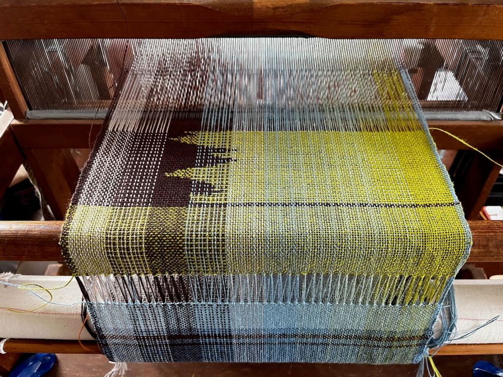 The reed is sleyed 1-1-2-1-1 to fit 18 epi into my 15 dent reed. As a result you can see reed marks in the right hand side of this photo, and in the city-scape picture above.