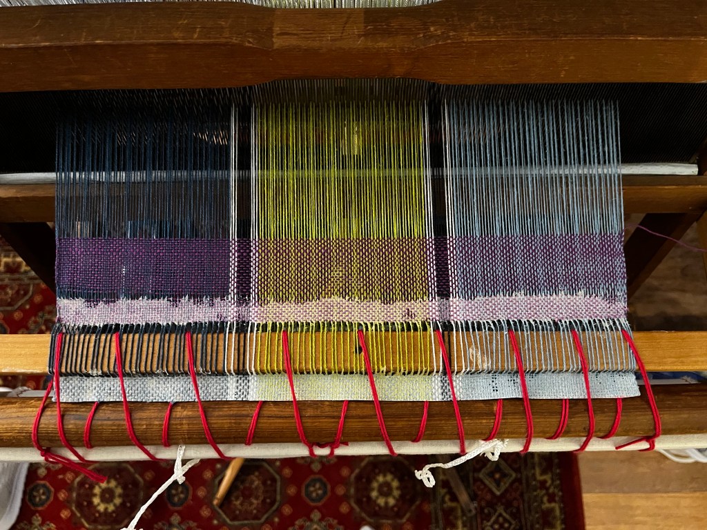The first thing I wove off this warp was a sample to discover the best weft colour combinations for this warp: