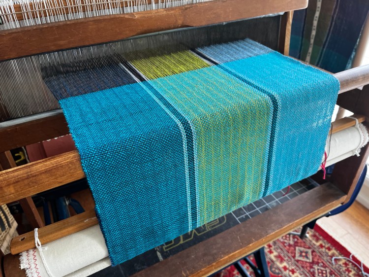 The plan here was to create a vertically striped fabric, with nothing fancy in the weft. That way if my weaving wasn’t even from pick to pick, I wouldn’t have to match anything horizontally (like checks or plaids).