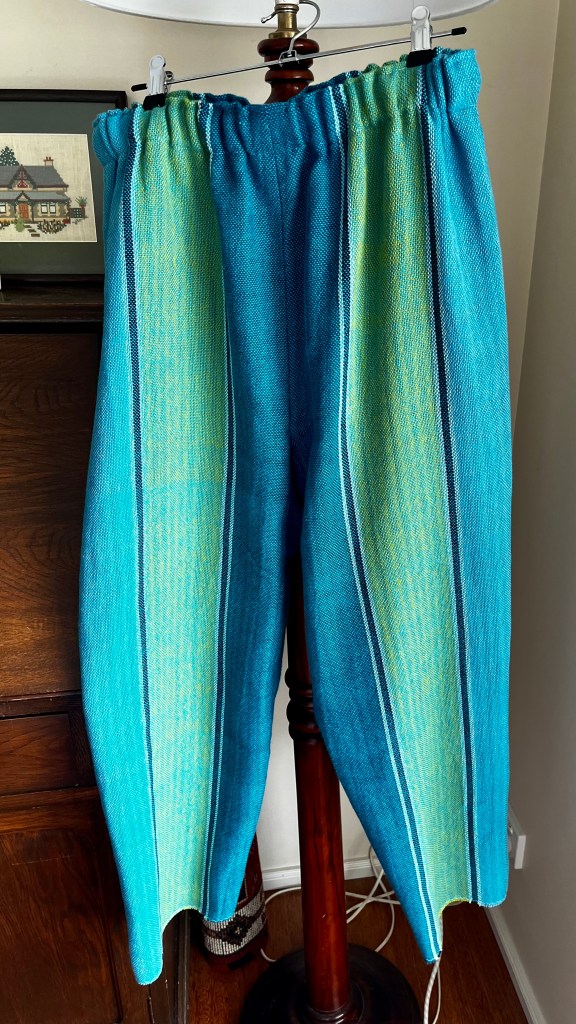 Since my handwoven fabric was bulkier than typical store-bought cloth, I bound the crotch seam with cotton binding, for strength and comfort.