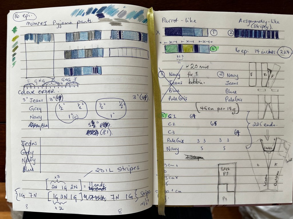 I started learning to weave late last year with Jane Stafford’s online School of Weaving. One of her lessons involves designing a warp, so I sat down with some coloured pencils and started drawing swatches.