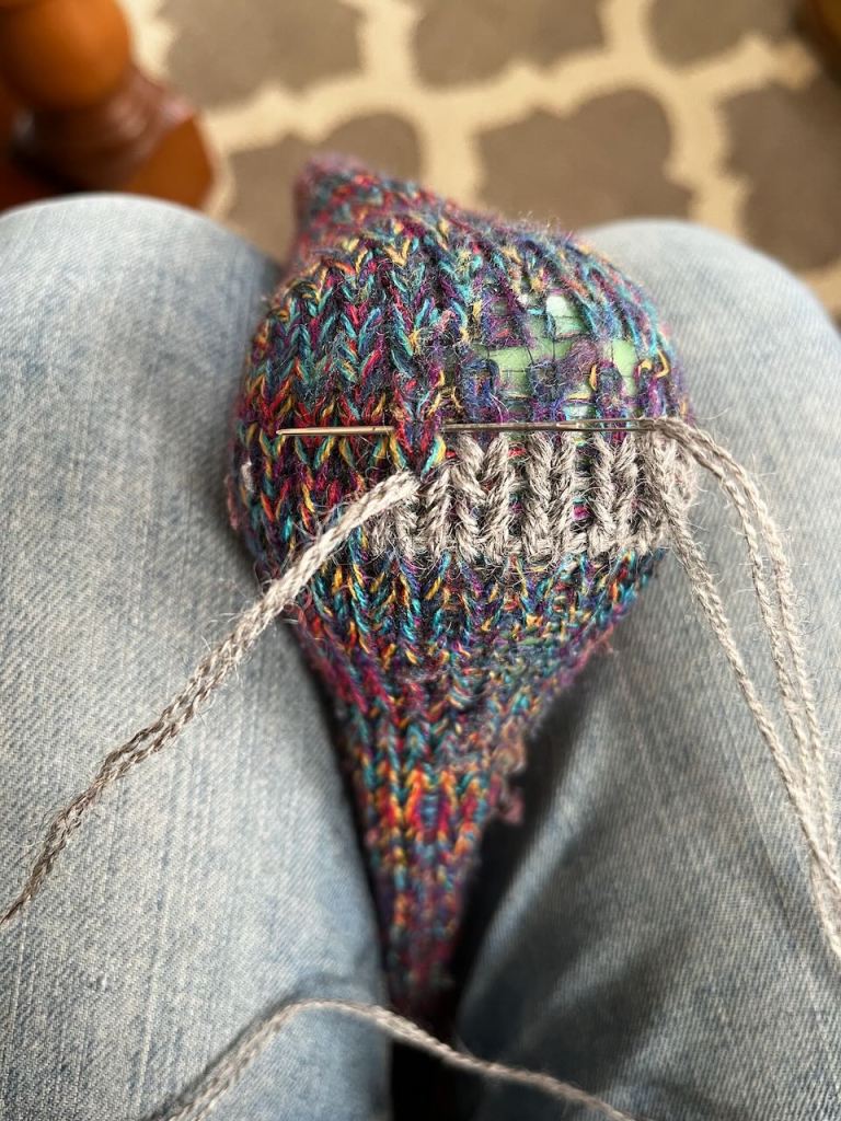 But I’m not making the classic cross hatch needle woven patch, instead I’m recreating the original knit stitches so the sock is still stretchy.