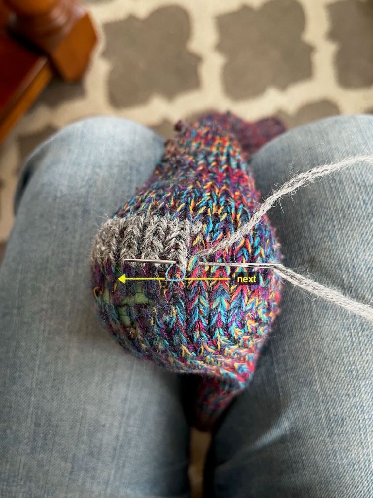 I’m using a tapestry needle to make stitches, following the path of each existing row. Here you can see me making the top of a stitch, working right-to-left (because I’m right-handed).
