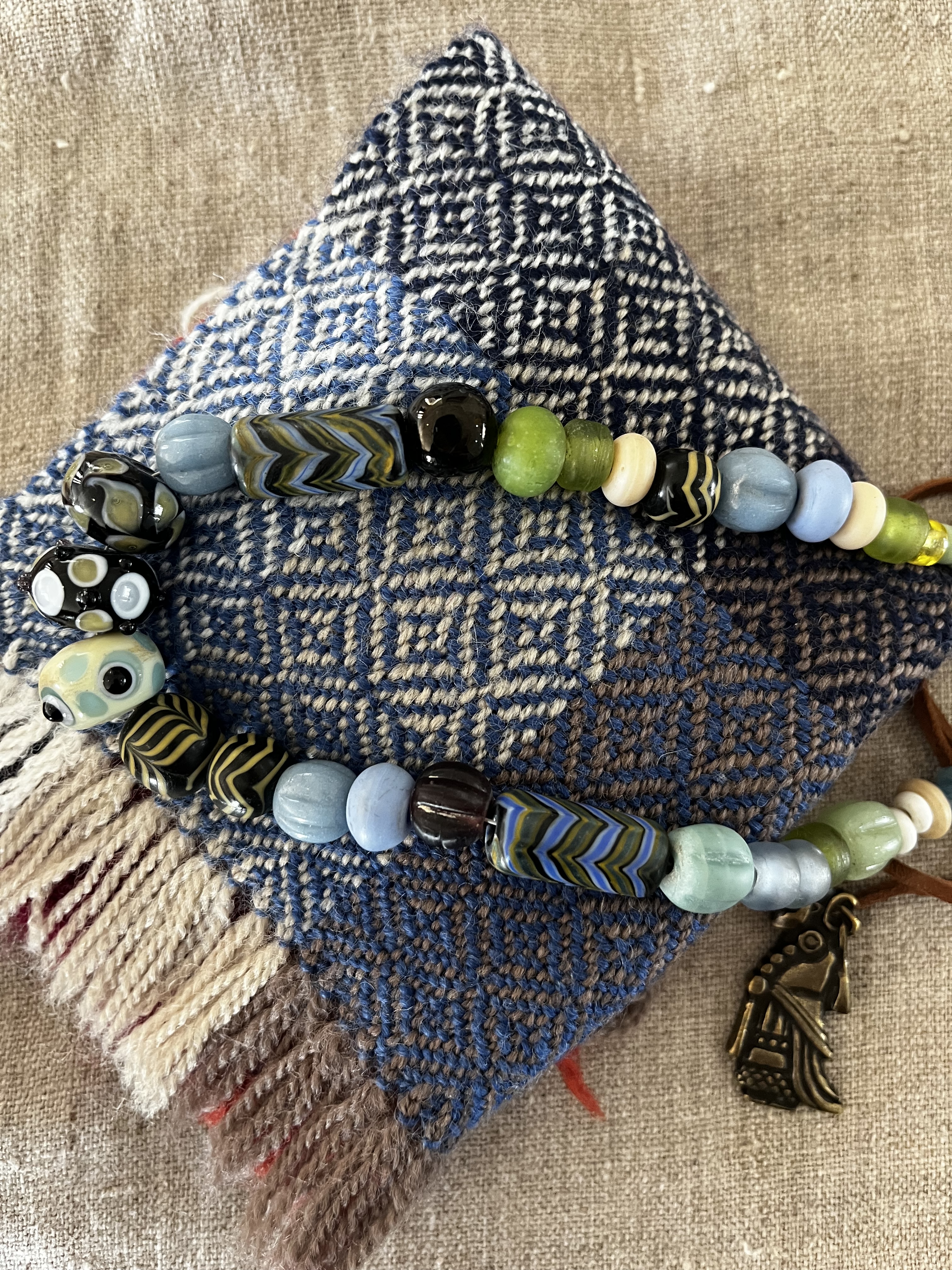 The first thing I wove off this warp was a sample to discover the best weft colour combinations for this warp: