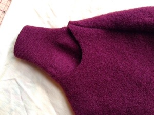 Having made a lot of Bum Sweaters, I knew I wanted that shaping, but to get more out of the sweater I have by changing the design. Cutting on the diagonal is not very efficient unless you can somehow use both parts of the diagonal cut. I tried doing this on a previous sweater by cutting up lots of smaller equilateral triangles and sewing four together, but they ended up getting holes on the seam lines due to weaknesses (I hand sewed them, to reduce the seam bulk).
