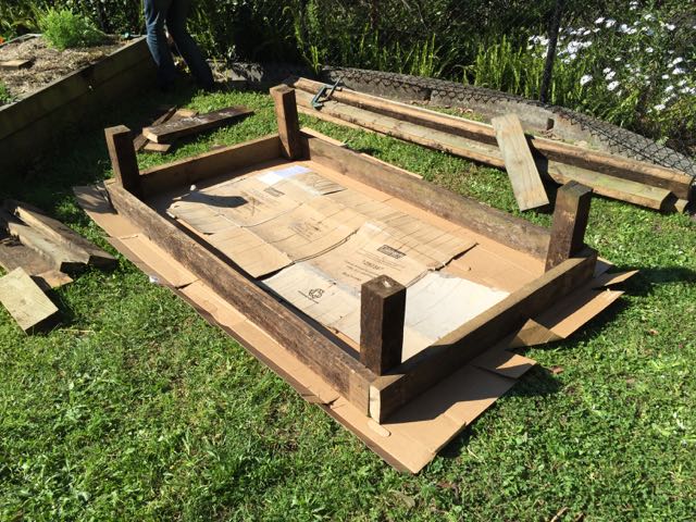 Then we laid down some cardboard in the new location, and started to cut and assemble the new bed.