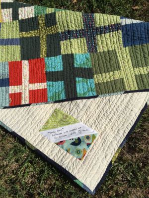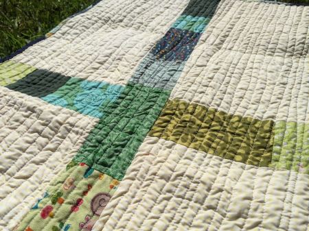I’ve already done some quilting on this piece — can you see the green strip that is face down? I’ve just sewn this piece to the existing quilting so that when I flip the piece over …