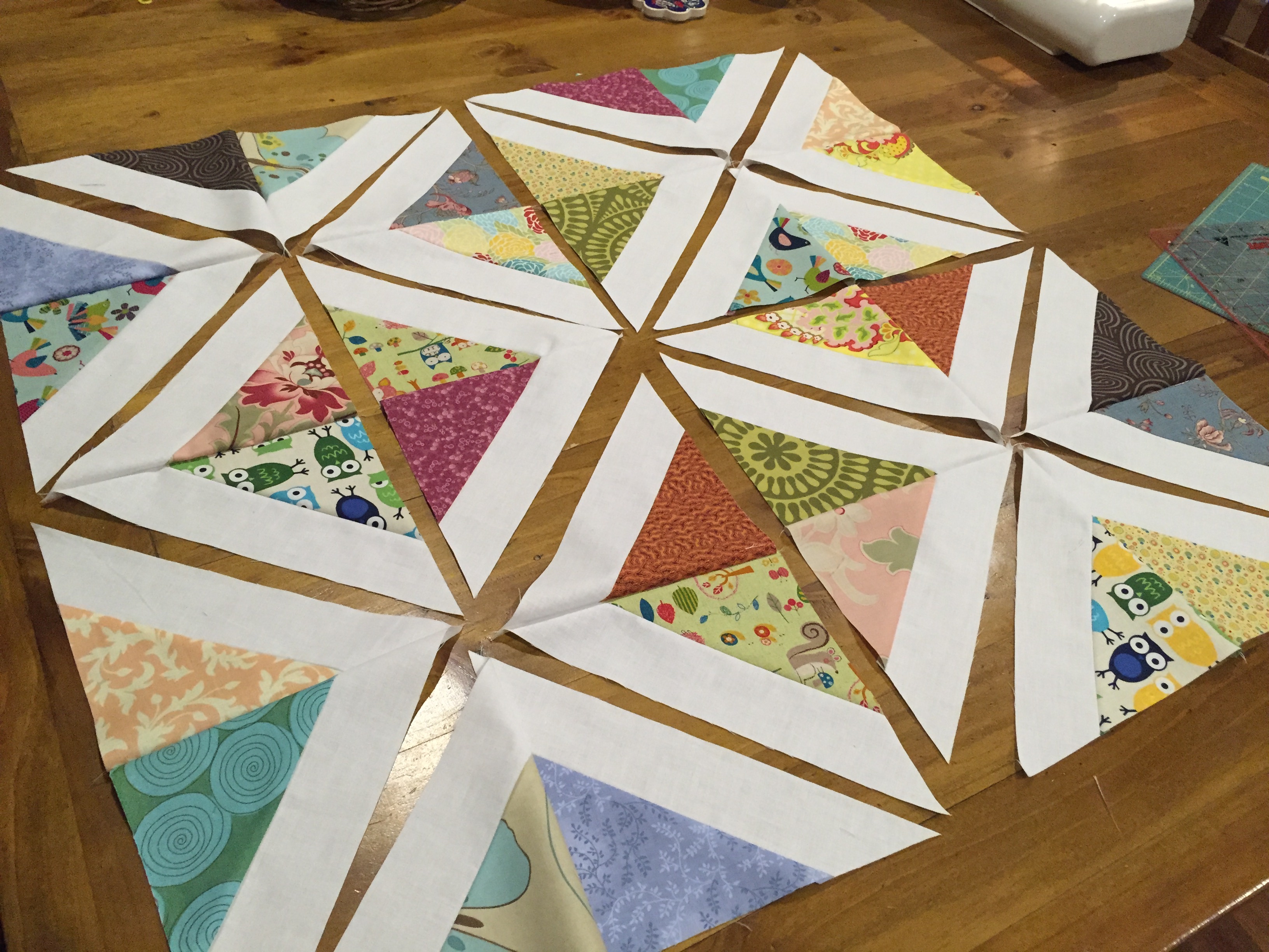 I arranged these into a pleasing arrangement, and worked out where I wanted my sashing to go (between each of the white sashing sections):
