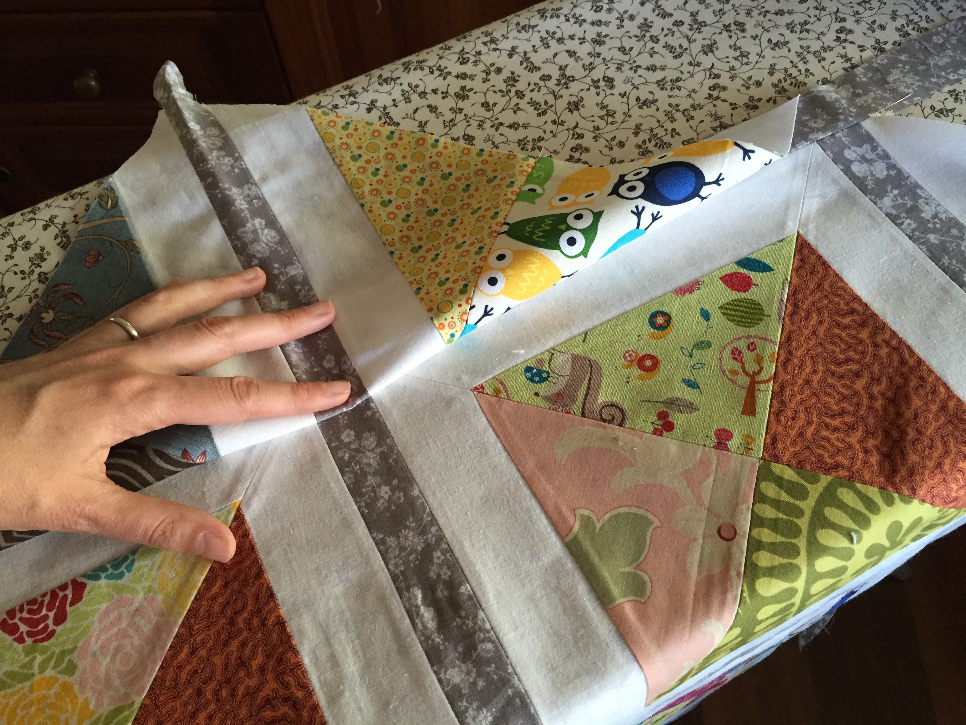 - I was concerned I’d have trouble matching up the blocks, especially where each coloured triangle meets up, and where the corners of the grey sashing meet.